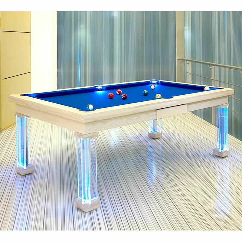 Biljarski stol s elegantnim i inovativnim dizajnom. Savršen za svaku prigodu, a posebno je prikladan za one koji traže stol za profinjen ambijent. Plave LED diode u nogama od pleksiglasa i košaricama čine ovaj biljarski stol jedinstvenim. Izrađen od ... Više
