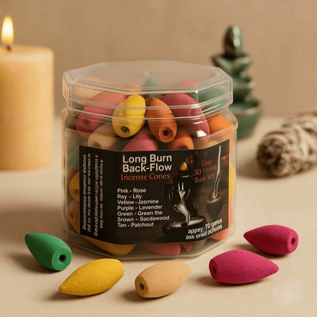 Dugogoreći mirisni čunjići sa povratnim protokom. Vrijeme gorenja do 30 minuta. Približno 70 čunjeva. 7 različitih boja i mirisa: ružičasta - ruža, crvena - ljiljan, žuta - jasmin, ljubičasta - ... Više