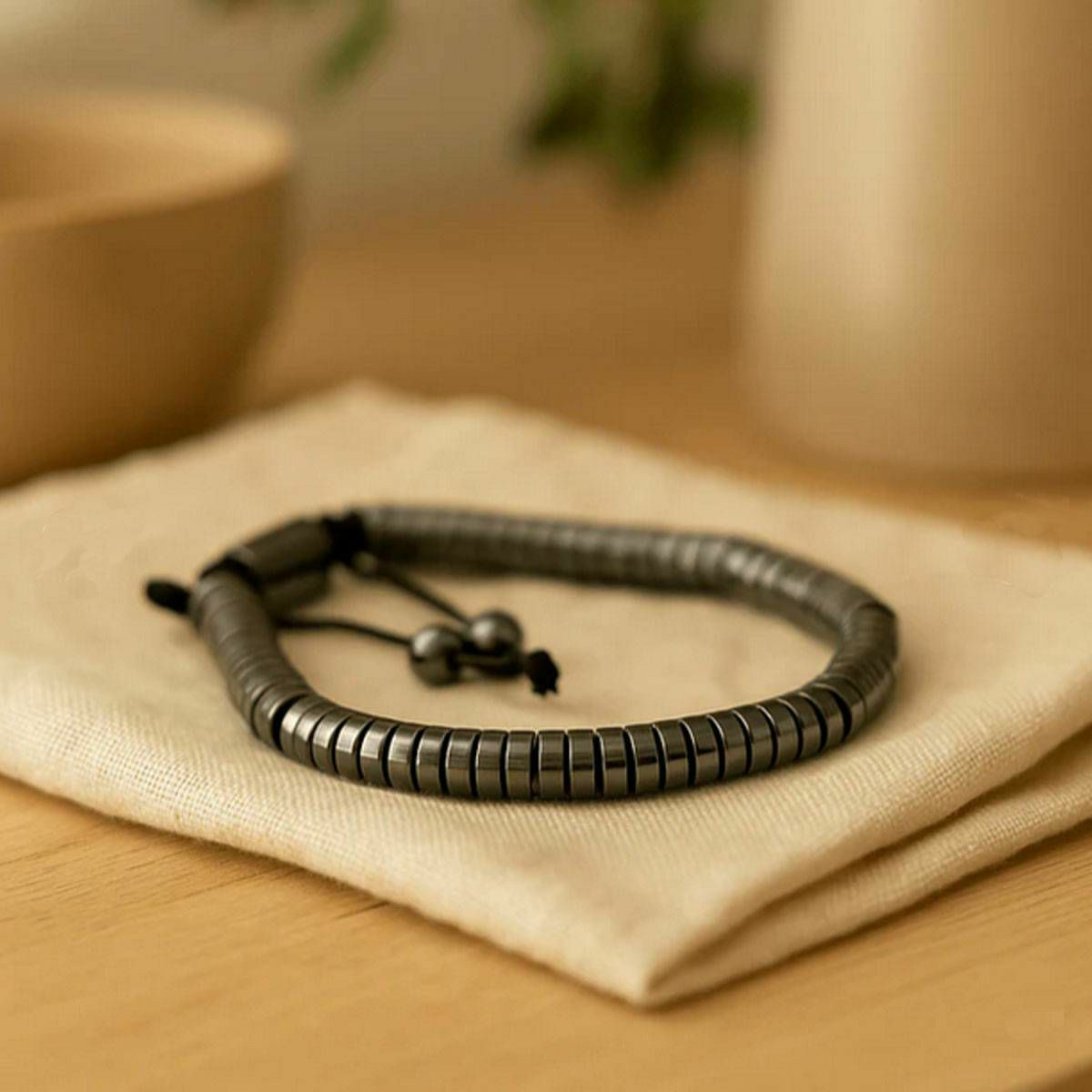 Ova zadivljujuća narukvica je vrsta nakita koja se obično izrađuje od malih perli hematita, minerala koji je prirodno magnetičan. Narukvica je izrađena s kliznim čvorom za podešavanje što joj omogućuje da se rasteže preko ruke i udobno pristaje na za ... Više