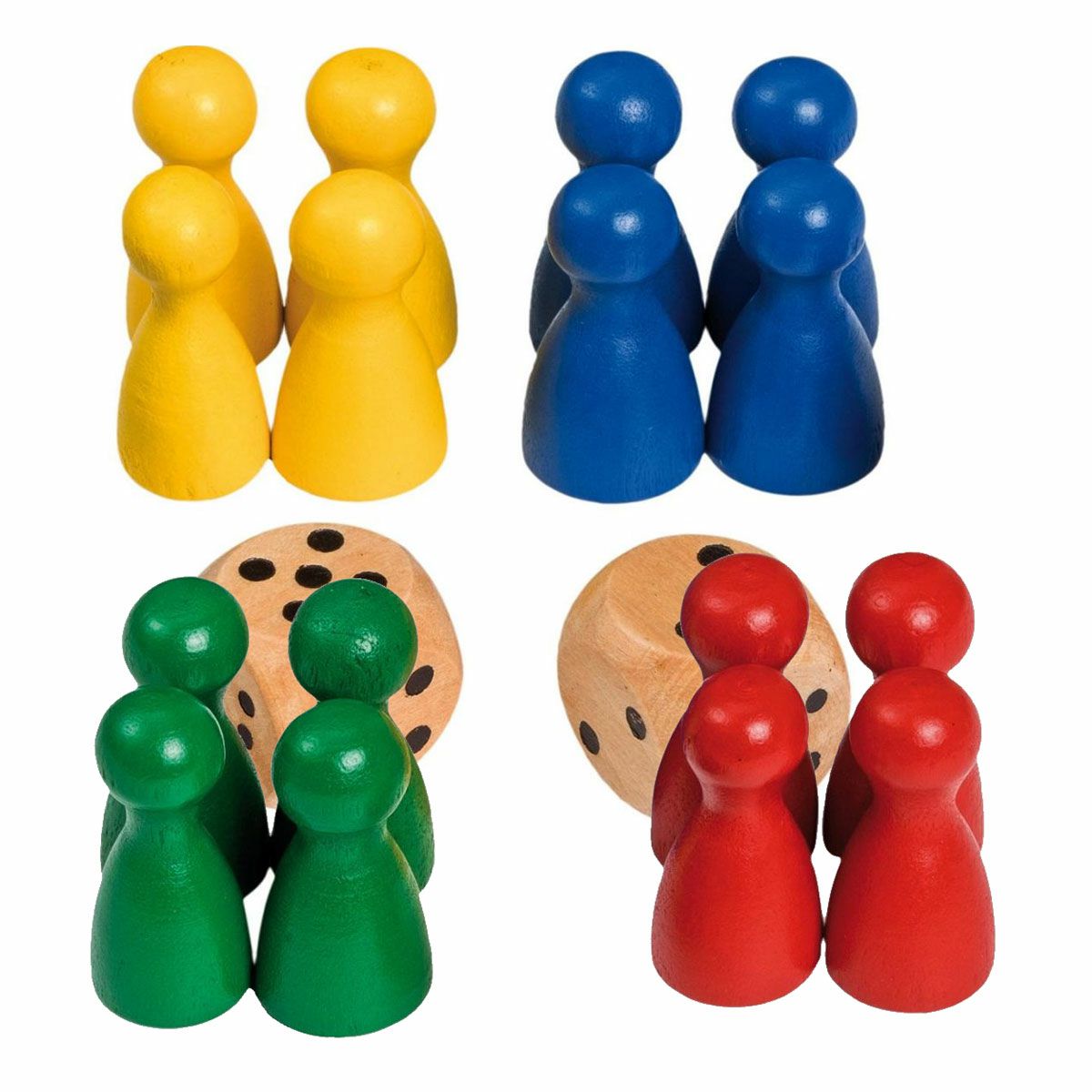 Kockice i pijuni. Set od 16 pijuna izrađenih od schima drva u crvenoj, žutoj, zelenoj i palavoj boji, svaka boja po 4 komada. Visina pijuna 25 mm, promjer 12 mm. Kockice izrađene od drva breze, u prirodnoj boji, visina brida 16 mm, 2 komada.