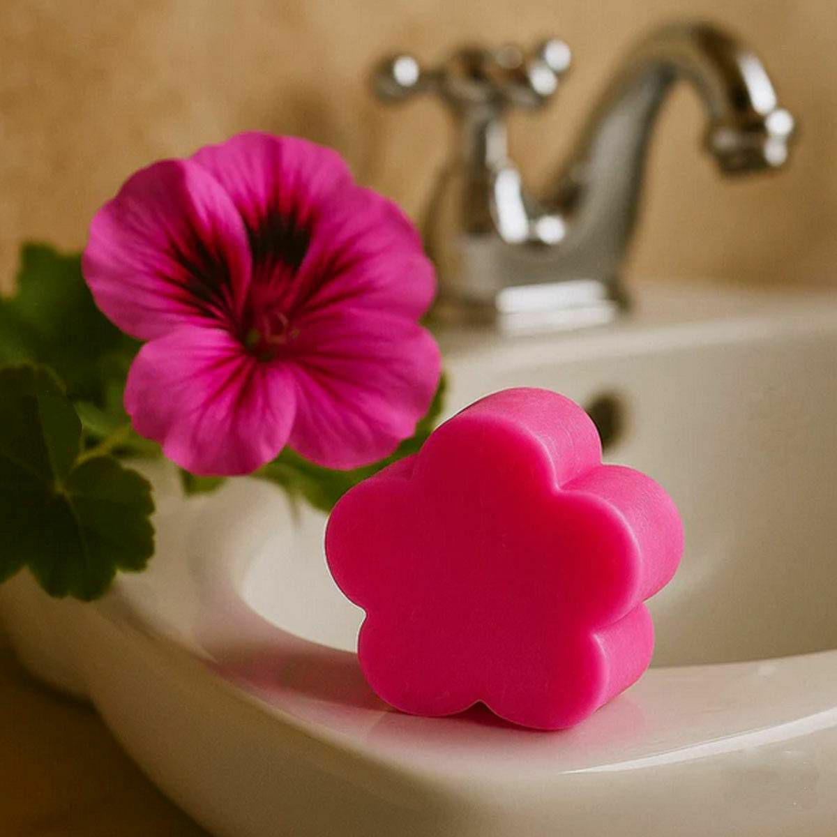 Lijepi mirisni sapuni za goste od geranije, u obliku cvijeta. Izvrsno mirišu te će privući ljude bilo kojeg ukusa... Izvrsno za hotele, pansione ili apartmane. Sapuni za goste su teški oko 25 grama, veličine oko 4 cm. Ne sadrže SLS i paraben.