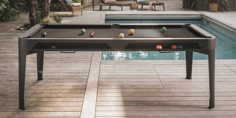 Vanjski stolovi za biljar slični su po stilu i performansama onima za unutarnju upotrebu. Velika razlika ovdje je jedino u korištenim materijalima. Obično imaju posebno obrađeno drveno kućište i noge, dizajnirani da budu otporni na vremenske uvjete, poput truljenja ili savijanja. Mnogi su također tretirani da budu otporni na UV zrake, koje mogu promijeniti boju i lak, a svi su opremljeni tkaninama otpornim na vremenske uvjete.