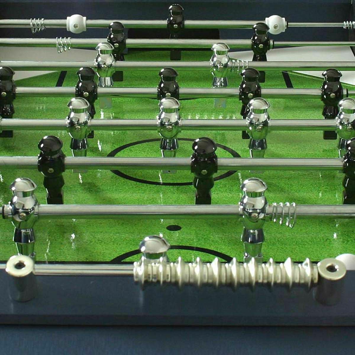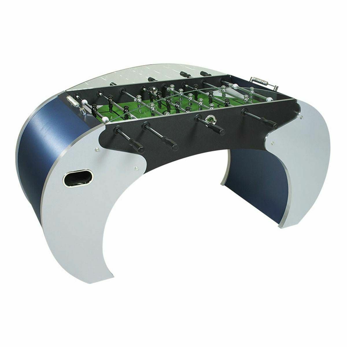 Stolni nogomet s inovativnim i originalnim dizajnom. Igraća površina 114 X 70 izrađena od MDF-a 9 mm prekriveno laminiranim PVC-om. Kaljeno staklo debljine 5 mm, aluminijski profili s kromiranim detaljima. Zaobljene noge od MDF-a debljine 36 mm prekr ... Više