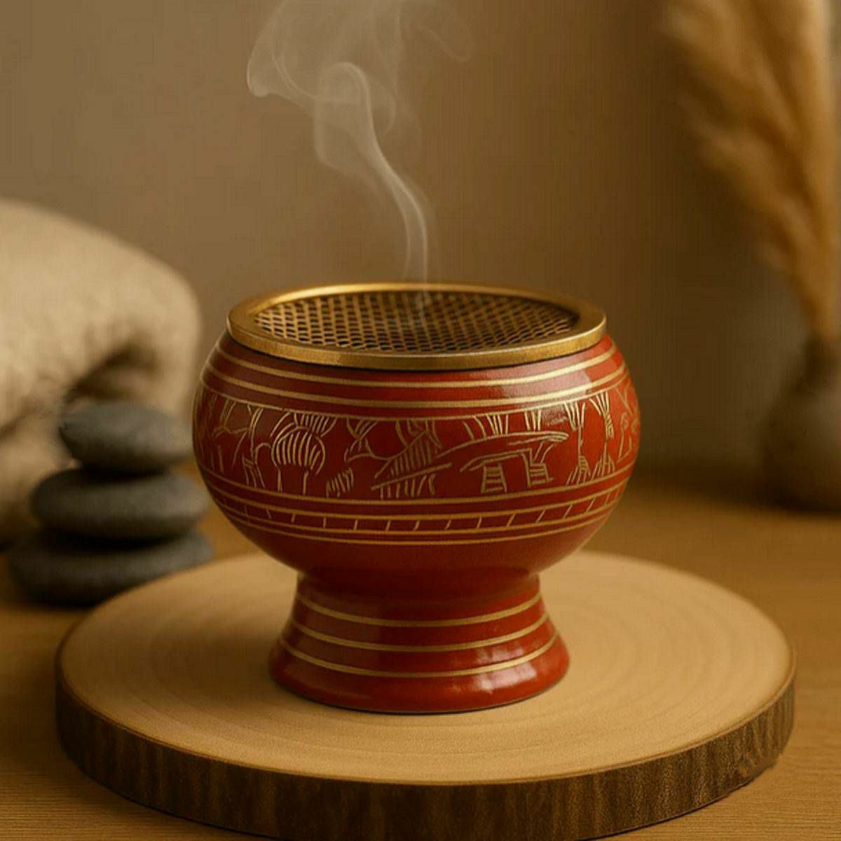 Tamjanica u prekrasnoj boji s nešto višim postoljem. Ukrašena zlatnim uzorcima, ručno izrađena u Indiji. Ova tamjanica se može koristiti tijekom rituala za pročišćavanje ili aktivaciju čakre solarnog pleksusa. Ove tamjanice namijenjene su za upotrebu ... Više