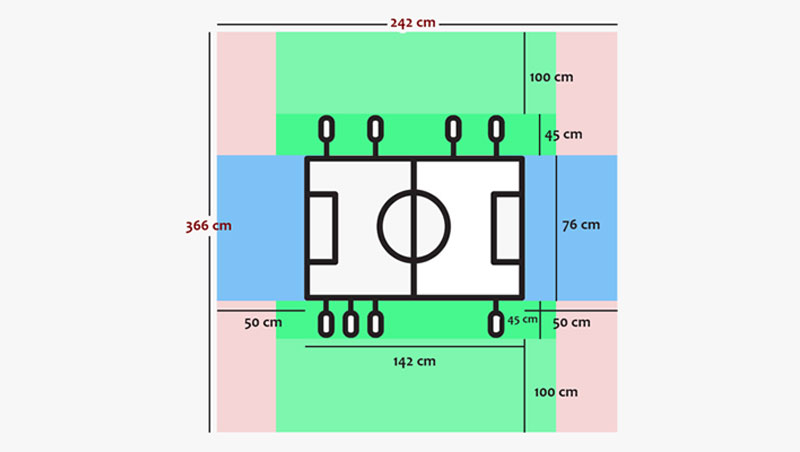 Sada morate provjeriti imate li dovoljno mjesta za odabrani stol. Trebali biste izmjeriti punu širinu stola, uključujući šipke u njihovoj punoj dužini - tu možete dodati 30-45 cm, ovisno o modelu. Zatim dodajte metar sa svake strane kako biste imali dovoljno mjesta za dvije osobe da komodno rukuju šipkama. Na krajevima gola potrebno vam je manje prostora ali i dalje morate imati mogućnost kretati se kako biste dohvatili loptice.